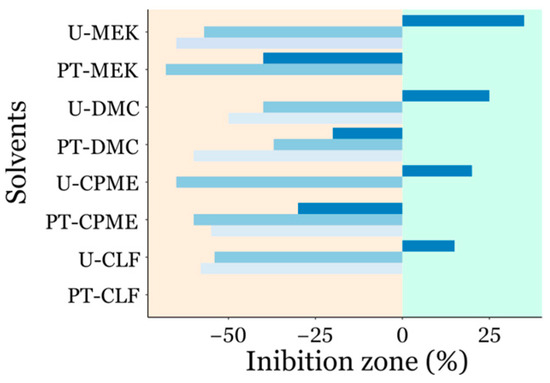 Inhibition zones were expressed as a percentage relative to vancomycin (the positive control) (Figure 4). A key finding is that, in all cases, larger inhibition zones were observed with extracts obtained from the untreated microalgae biomass. Interestingly, against E. coli, the U-DMC, U-CPME, U-CLF, and especially U-MEK extracts exhibited inhibition zones exceeding those of vancomycin by +25%, +20%, +15%, and +35%, respectively. In all the other cases the extracts had reduced efficacy (up to –68% with PT-MEK) compared to vancomycin. In addition, PT-CLF and PT-MEK showed no antimicrobial activity with all microorganisms and with B. subtilis, respectively. No inhibition zone was observed with 5% Tween-20 and 10% DMSO aqueous solution (negative control).
