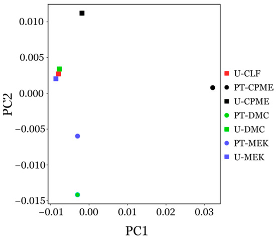 The GC/MS profile for each extract showed more than 400 distinct peaks, revealing a high degree of complexity (Figure S3). To reduce this complexity, chromatograms were normalized and subjected to principal component analysis (PCA). The outcome of the PCA provided two eigenvectors, PC1 and PC2, which represent 62% and 19% of the total variance, respectively (Table S2). This suggests that the first two principal components captured most of the variation of the data. The PCA revealed two clusters with a clear distinction between pre-treated and untreated extracts (Figure 5), indicating that the pre-treatment causes a marked variation of the chemical composition of the extracts. In accordance with Table 2, untreated extracts not only have similar GC-MS chromatogram profiles, but they also show higher antimicrobial activity.