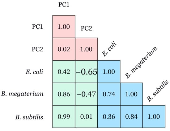 PC1 shows a positive correlation with E. coli (0.43), B. megaterium (0.86), and B. subtilis (0.99), indicating an increase in MIC for all three bacterial strains with increasing PC1 values (Figure 6). Consequently, extracts with higher PC1 values exhibit lower antimicrobial activity against these bacteria. PC2 exhibits a negative correlation with E. coli (−0.65) and B. megaterium (−0.48) and no correlation with B. subtilis. This suggests that an increase in PC2 values is associated with a decrease in minimum inhibitory concentrations and indicates greater antimicrobial activity against E. coli and B. megaterium.