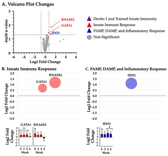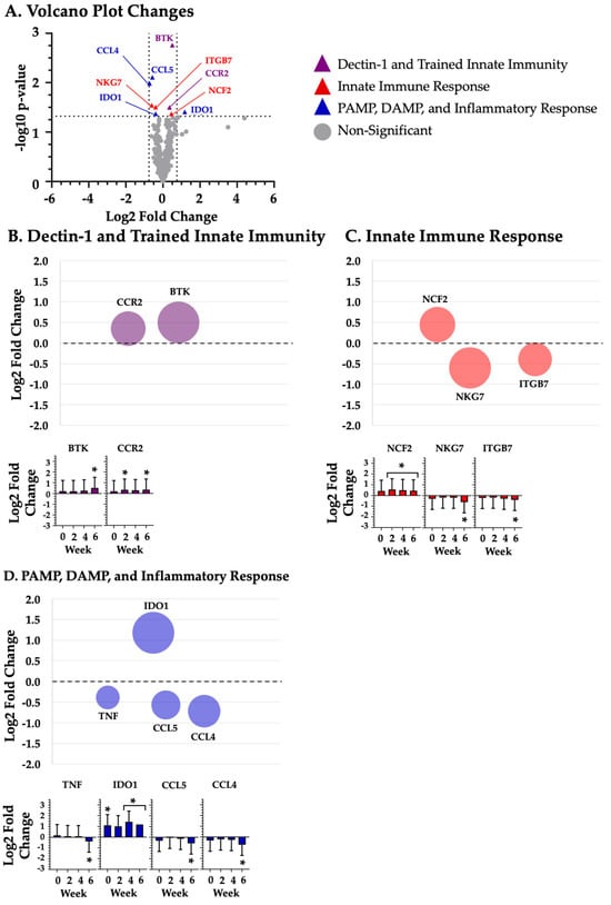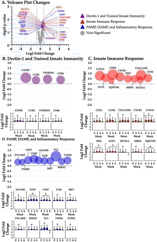 Six weeks of BYBG supplementation. Differentially expressed BYBG mRNAs compared to placebo mRNAs at 6 weeks. Panel (A) represents a volcano plot of the differential gene expression between BYBG and placebo. Significantly changed mRNAs at baseline are represented by purple (dectin-1 and trained immunity), red (innate immune response), and green (PAMP, DAMP, and inflammatory response) triangles. Panel (B), Panel (C), and Panel (D) show a bubble plot and standard bar graphs of individual mRNAs associated with dectin-1 and trained innate immunity, innate immune response, and PAMP, DAMP, and inflammatory response, respectively. * indicates significant mRNA expression change (p < 0.05).