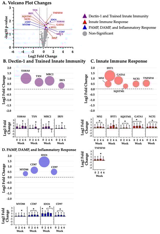 Two weeks of BYBG supplementation. Differentially expressed BYBG mRNAs compared to placebo mRNAs at 2 weeks. Panel (A) represents a volcano plot of the differential gene expression between BYBG and placebo. Significantly changed mRNAs at baseline are represented by purple (dectin-1 and trained immunity), red (innate immune response), and green (PAMP, DAMP, and inflammatory response) triangles. Panel (B), Panel (C), and Panel (D) show a bubble plot and standard bar graphs of individual mRNAs associated with dectin-1 and trained innate immunity, innate immune response, and PAMP, DAMP, and inflammatory response, respectively. * indicates significant mRNA expression change (p < 0.05).