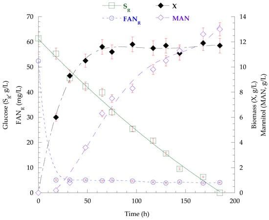 Kinetics of glucose (SR) and FANR concentration, as well as of the biomass and mannitol production derived from the batch cultivation of C. curvatus NRRL YB-775 on glucose-based medium under nitrogen limitation (C/N = 160 mol/mol).