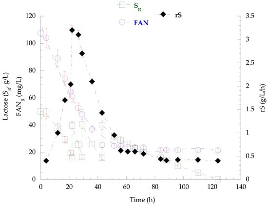 Kinetics of lactose (SR) and FANR concentration, as well as of the lactose consumption rate (rS) derived from the fed-batch cultivation of P. laurentii NRRL YB-3594 on SCW, pulse-supplemented with concentrated lactose solution.