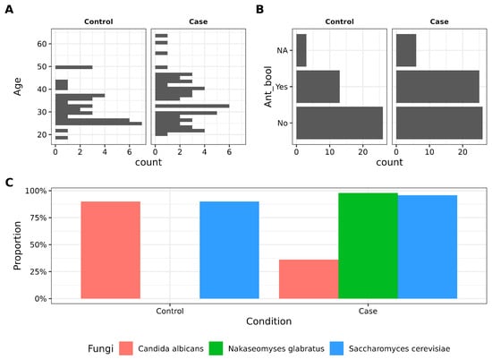 Main variables driving the study. (A). Histogram depicting the age (in years) distribution between control and case groups. No statistical difference was found according to the Student’s t-test. (B). Barplot showing antibiotic intake in women. (C). Barplot showing the proportion of control and case groups with three different fungi detected by PCR.