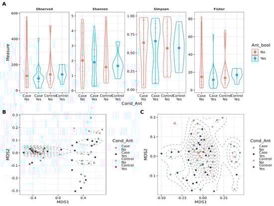 Diversity metrics for stratified groups, considering antibiotic intake and condition (case vs. control). (A). Violin plot depicting alpha diversity metrics (Observed number of ASVs, Shannon, Simpson, and Fisher) for the groups. (B). Scatter plot showing Non-Metric Multidimensional Scaling (NMDS) for weighted Unifrac distance for beta diversity assessment in the groups. ADONIS was applied to account for the variance explained by Condition (p = 0.036, = 0.05) and Antibiotic intake (p = 0.39, = 0.01). (C). Scatter plot showing Non-Metric Multidimensional Scaling (NMDS) for unweighted Unifrac distance for beta diversity assessment in the groups. ADONIS was applied to account for the variance explained by Condition (p = 0.012, = 0.03) and Antibiotic intake (p = 0.018, = 0.03).