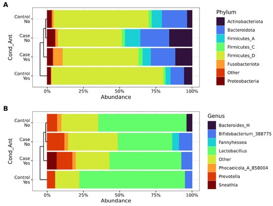 Relative abundance for stratified groups, considering antibiotic intake and condition (case vs. control). (A). Phylum relative abundance as percentages. (B). Genus relative abundance as percentages. Taxa are identified on the right side of each figure.