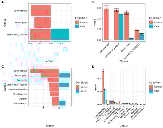 Important biomarker bacteria considering antibiotic intake and condition. (A,B), Using ALDEx2 (“ antibiotic intake + RVVC condition”). (C,D), using LEFSE (Class = RVVC, Subclass = antibiotic intake). Only features with p-values that passed FDR correction were included in the graphs. (A). Barplot showing ALDEx2 results for condition (case vs. control). The X-axis shows the effect, and the Y-axis shows the genus. Negative values correspond to control, positive values correspond to cases. (B). Barplot of mean sqrt of relative abundance of taxa found by ALDEx2. The X-axis shows the mean sqrt of relative abundance, and the Y-axis shows the genera. (C). Barplot showing LEFSE results for condition (case vs. control). The X-axis shows the LDA scores, and the Y-axis shows the genus. Negative values correspond to control; positive values correspond to cases. (D). Barplot of mean sqrt of relative abundance of taxa found by LEFSE. The X-axis shows the mean sqrt of relative abundance, and the Y-axis shows genus.