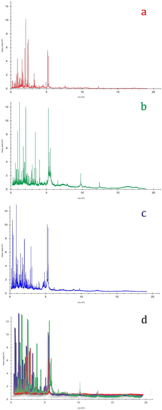 Characteristic spectral profiles of milk samples obtained from bovine (a), ovine (b), caprine (c) sources and (d) overlay of the three species’ spectra (Colours correspond to species as follows: red = bovine, green = ovine and blue = caprine).