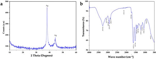 Composition and structure analysis of silver nanoparticles (AgNPs) produced by L. fusiformis. (a) X-ray diffraction (XRD) profile and (b) infrared spectroscopy profile of green-synthesized AgNPs. The XRD spectrum shows two primary peaks at 2θ≈38° and 2θ≈45°, which typically correspond to silver signals. The FTIR spectrum reveals bands indicative of O-H stretching (around 3400 cm−1), C-H stretching (around 2900 cm−1), and a possible C=O group (between 1500 and 1600 cm−1).
