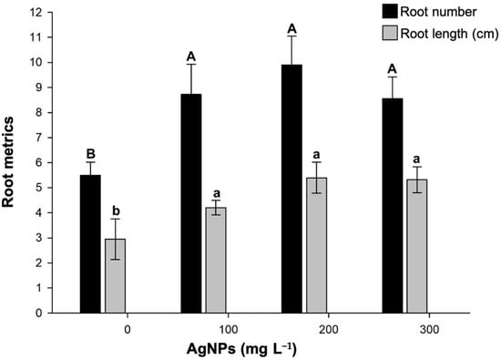 Impact of green-synthesized AgNPs on in vitro rooting of strawberries. Different upper- or lower-case letters between AgNP concentrations indicate statistically significant differences (p ≤ 0.05). Mean ± standard error is shown.