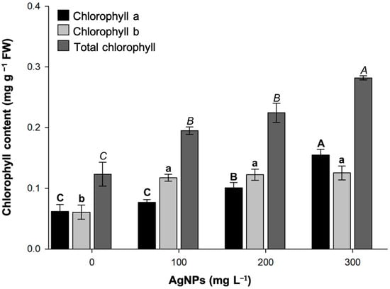 The photosynthetic pigments of strawberry plants were quantified to study their physiological response to AgNPs (Figure 5). Overall, the addition of AgNPs was found to enhance chlorophyll production. Increases in chlorophyll concentration were observed only in the 200 and 300 mg L−1 treatments. The presence of 100 mg L−1 AgNPs was insufficient to induce changes in chlorophyll compared to the untreated plants. Conversely, there were no significant differences in chlorophyll b content among the 100, 200, and 300 L−1 AgNP concentrations; however, all were higher than the values determined in the control treatment. Finally, total chlorophyll gradually increased, reaching a maximum peak at 300 mg L−1 AgNPs, with approximately 0.3 mg g−1 FW. This value was twice that quantified in leaves in AgNP-free shoots.
