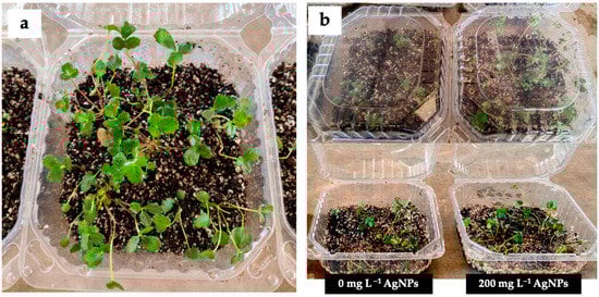 A critical step in the commercialization of plantlets is the adaptation of the micropropagated material to greenhouse or field conditions. In this regard, rooted strawberry shoots, both in the presence and absence of AgNPs, were transferred to a sterile substrate of peat moss and agrolite (1:1 v/v). The concentration of 200 mg L−1 was selected for this experiment, as it induced a more developed root system. In agreement with the in vitro results, the plants exposed to AgNPs showed a better adaptation to the substrate, which resulted in individuals with greater vigor and size (Figure 6a). After 6 weeks, the survival rate of plants with AgNPs reached 90%, which was significantly higher than the 50% observed in the treatment without AgNPs (Figure 6b). Interestingly, plants grown with AgNPs showed better performance in preliminary experiments of 50% irrigation reduction.