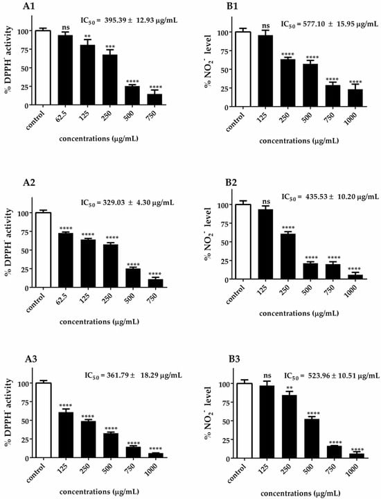 The assessment of antioxidant activity requires a multifaceted approach due to the intricate nature of chemical constituents and their diverse mechanisms of action. In this study, the similar patterns observed between DPPH• radical scavenging activity (A1–A3) and •NO scavenging activity (B1–B3) in Figure 3 can be attributed to several interconnected antioxidant mechanisms inherent in Chlorella extracts. Both DPPH• and •NO radical scavenging assays rely on the hydrogen-donating capacity of antioxidant compounds, explaining why extracts with a high DPPH• scavenging activity also demonstrate strong •NO scavenging properties. The parallel dose–response relationships observed across both assays suggest that the same bioactive compounds are responsible for both radical scavenging activities.