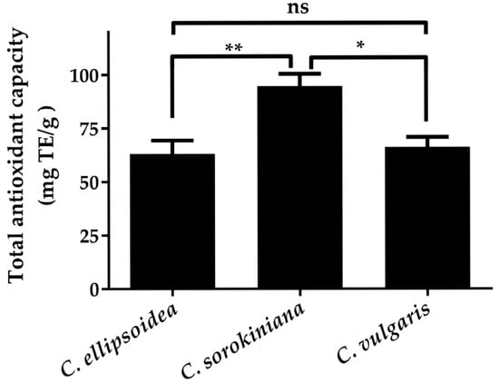 Total antioxidant capacity of C. ellipsoidea, C. sorokiniana, and C. vulgaris measured by FRAP assay. Data are presented as mean ± standard deviation (n = 3). Statistical differences were evaluated using two-way ANOVA followed by Tukey’s post hoc test. Significant differences: p < 0.05 (*), p < 0.01 (**), ns = not significant.