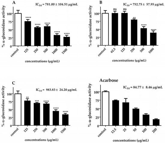To assess α-glucosidase activity inhibition, a previously reported procedure was followed, as outlined by Ferreres et al. [39]. Inhibitory activity against α-glucosidase was evaluated by incubating 50 µL of extract with 130 µL of 100 mM phosphate buffer (pH 6.8) and 20 µL of α-glucosidase (0.28 U/mL) at 37 °C for 10 min. Afterward, 100 µL of 0.5 mM 4-nitrophenyl α-D-glucopyranoside was added. The reaction was quantified by measuring the absorbance at 405 nm and this was compared with acarbose as the positive control.