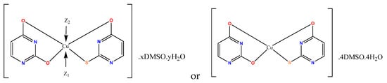 A proposed structural arrangement and the corresponding coordination binding sites in the copper complex. If Z1 = H2O or DMSO-h6 then Z2 = H2O or DMSO-h6 [38].