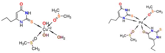 The illustration of the suggested coordination binding sites for 6-propyl-2-thiouracil with copper and palladium [37].