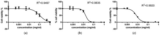 Concentration–response curves of (a) 2,4-dithiouracil and its (b) Cu(II) and (c) Au(III) complex against the Vero cell line (kidney cells from African green monkey).