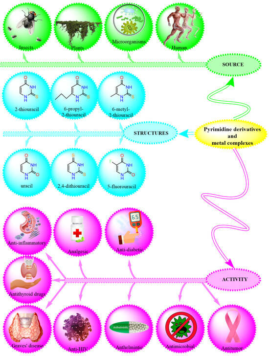 Different applications and structures of pyrimidine derivatives and their metal complexes.