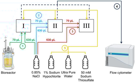 Schematic illustration of the sampling and dilution workflow for ART-FCM. The OC-300 Duo automation module is equipped with three dilution chambers (I, II, and III) for performing sequential serial dilutions. When dilution is required, 70 µL of biosuspension is drawn from the bioreactor (1) and mixed with 630 µL of 0.85% NaCl in chamber I. A 70 µL aliquot is then transferred to chamber II (2) and diluted again with 630 µL of 0.85% NaCl. For a 1:1000 dilution, the process is repeated in chamber III (3). For higher dilution factors, earlier chambers are emptied and reused for additional dilution steps. The final diluted sample is then transferred to the flow cytometer (4) for measurement. After each measurement cycle, all tubing and chambers are cleaned using designated cleaning solutions (5) to avoid cross-contamination. Created in BioRender. Heins, A. (2025) https://BioRender.com/x1uq4fs.