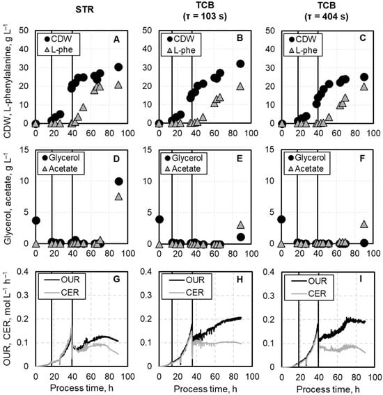 Comparison of the process performance of the L-phenylalanine production with E. coli FUS4 (pF81Kan) 3RP in a STR and TCB with mean residence times of 102 s, and 403 s in the CFI, respectively. (A–C) show the cell dry weight (CDW) together with the L-phenylalanine concentration (L-phe), while (D–F) depicts the substrate glycerol together with the byproduct acetate. (G–I) present the oxygen uptake rate (OUR) and carbon dioxide evolution rate (CER). The first vertical line indicated the end of the initial batch phase and the start of the biomass production phase. The second vertical depicts the start of the L-phenylalanine production phase.
