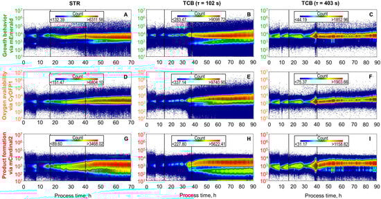 Histogram distributions from automated real-time flow cytometry where fluorescence intensity is plotted against the process time during the L-phenylalanine production process with E. coli FUS4 (pF81Kan) 3RP in an STR (first column), a TCB with τ = 102 s in the CFI (second column), and a TCB with τ = 403 s in the CFI (third column). Histogram distributions of rrnB-mEmerald are shown in the graphs (A–C), of narGHIJ-CyOFP1 in (D–F) and of aroFBL-mCardinal2 in (G–I). The first vertical line indicates the end of the initial batch phase, while the second vertical line the beginning of the L-phenylalanine production phase. Each plot includes a fluorescence count legend indicating population density.