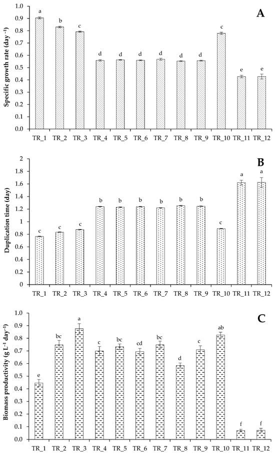 Specific growth rate (A), doubling time (B), and biomass productivity (C) of a culture of T. obliquus grown under strategies outlined in Table 2. Means that do not share a letter are significantly different (Tukey method and 95% confidence).