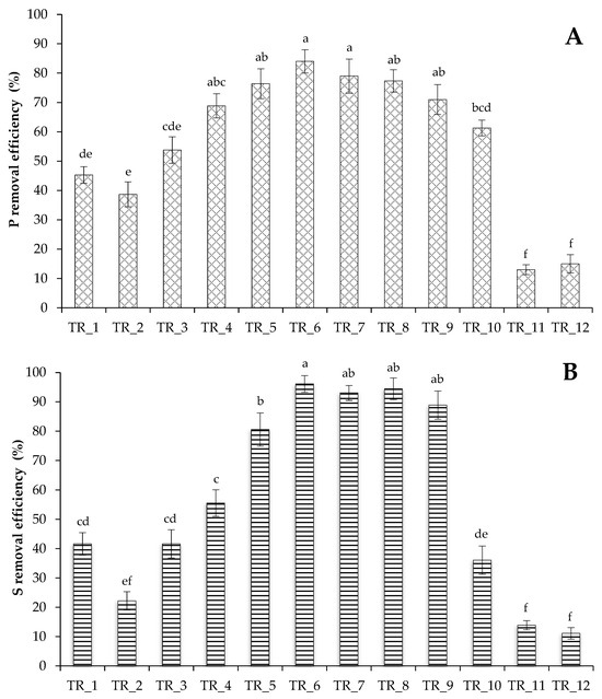 P (A) and S (B) removal efficiency by a culture of T. obliquus grown under strategies outlined in Table 2. Means that do not share a letter are significantly different (Tukey method and 95% confidence).
