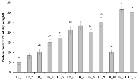 Regarding the protein level, as expected, the increase in N concentration in the medium promoted the algal cells to accumulate protein (Figure 4). The protein content under the tested conditions ranged from 5.1% to 31.7% of DW. The level of protein in algal cells during growth in the modified medium increased and amounted to 21.4 ± 1.9% of DW with a ten-fold increase in N-concentration in the culture medium (TR_6), while an additional supply of micronutrients (TR_7 and TR_8) did not significantly affect the protein pool in the cells. Moreover, replacing NaOH with a controlled supply of NaHCO3 for pH control under similar nutrient loading conditions (TR_10 versus TR_3 and TR_9 versus TR_7) did not lead to a significant increase in soluble protein levels in the biomass. In experiments with air injection alone (≈400 ppmv CO2; TR_11) and in experiments with air injection and controlled NaHCO3 supply (TR_12), protein levels were also comparable (Figure 4).