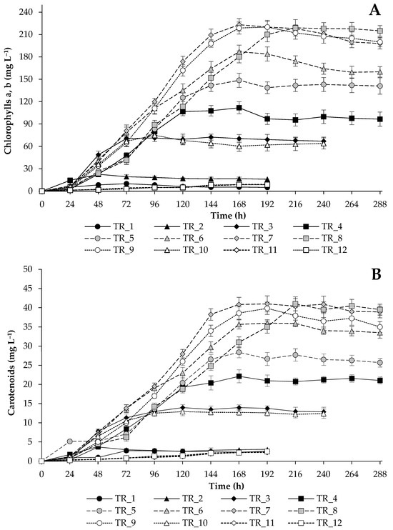 Total chlorophylls (A) and total carotenoids (B) concentrations obtained during the growth of T. obliquus under strategies outlined in Table 2.