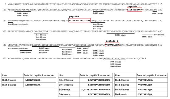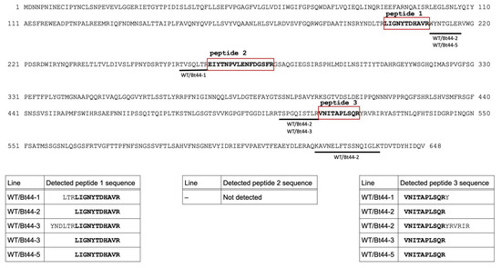 3.4. Proteomic Analysis of Cry1Ab Peptides in Transgenic and Transgrafted Plants