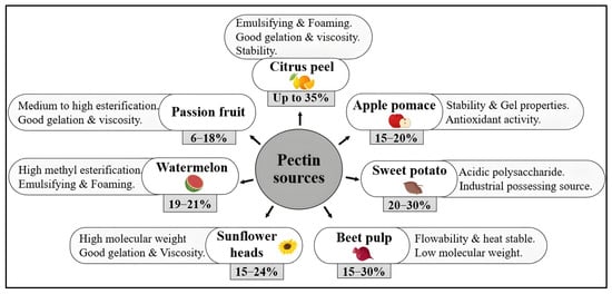 Major plant-based sources of pectin, with approximate pectin content (%) and key functional properties.