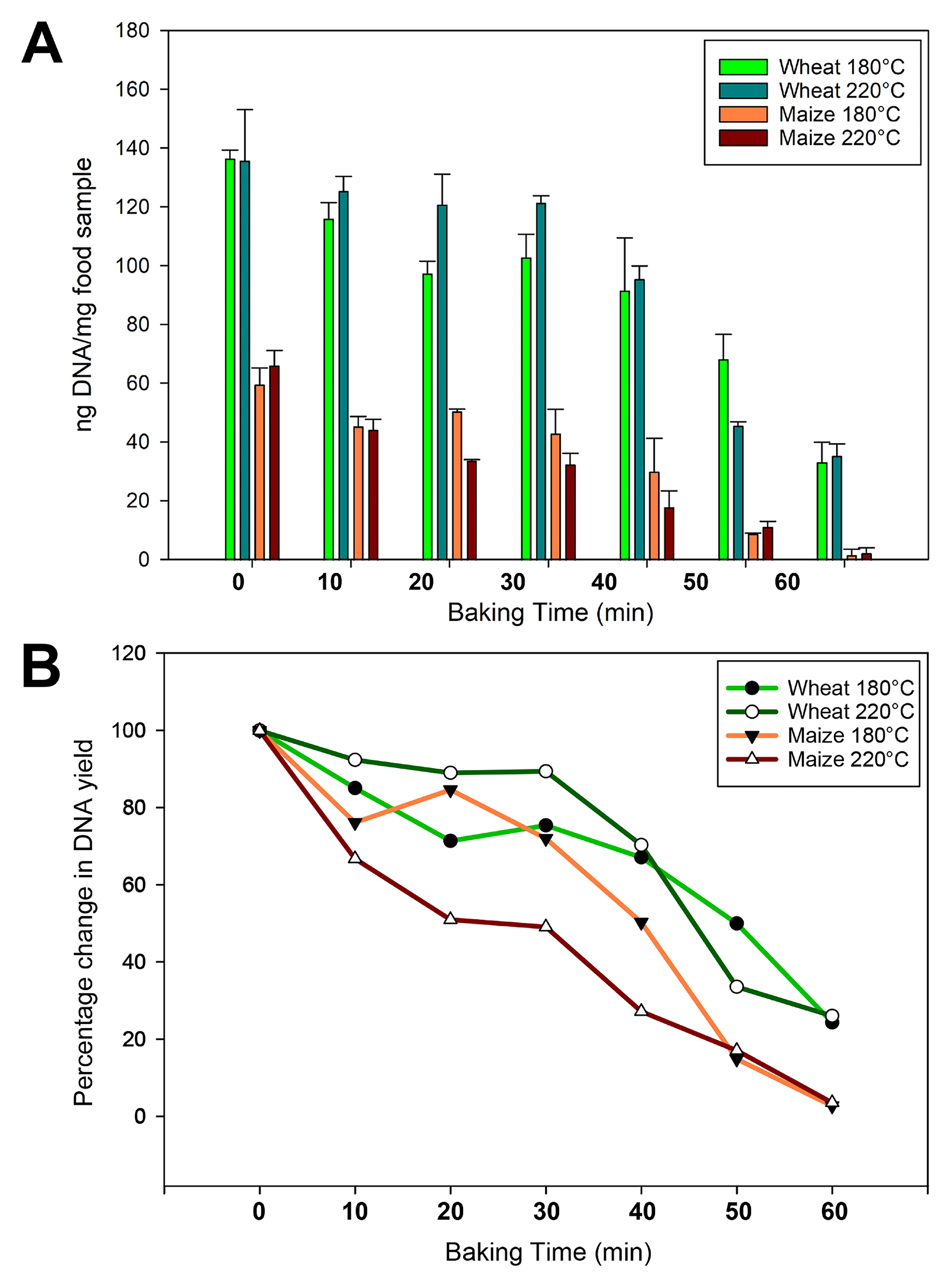 Table 4. DNA concentration/yield and purity of the maize samples baked at 180 °C and 220 °C.