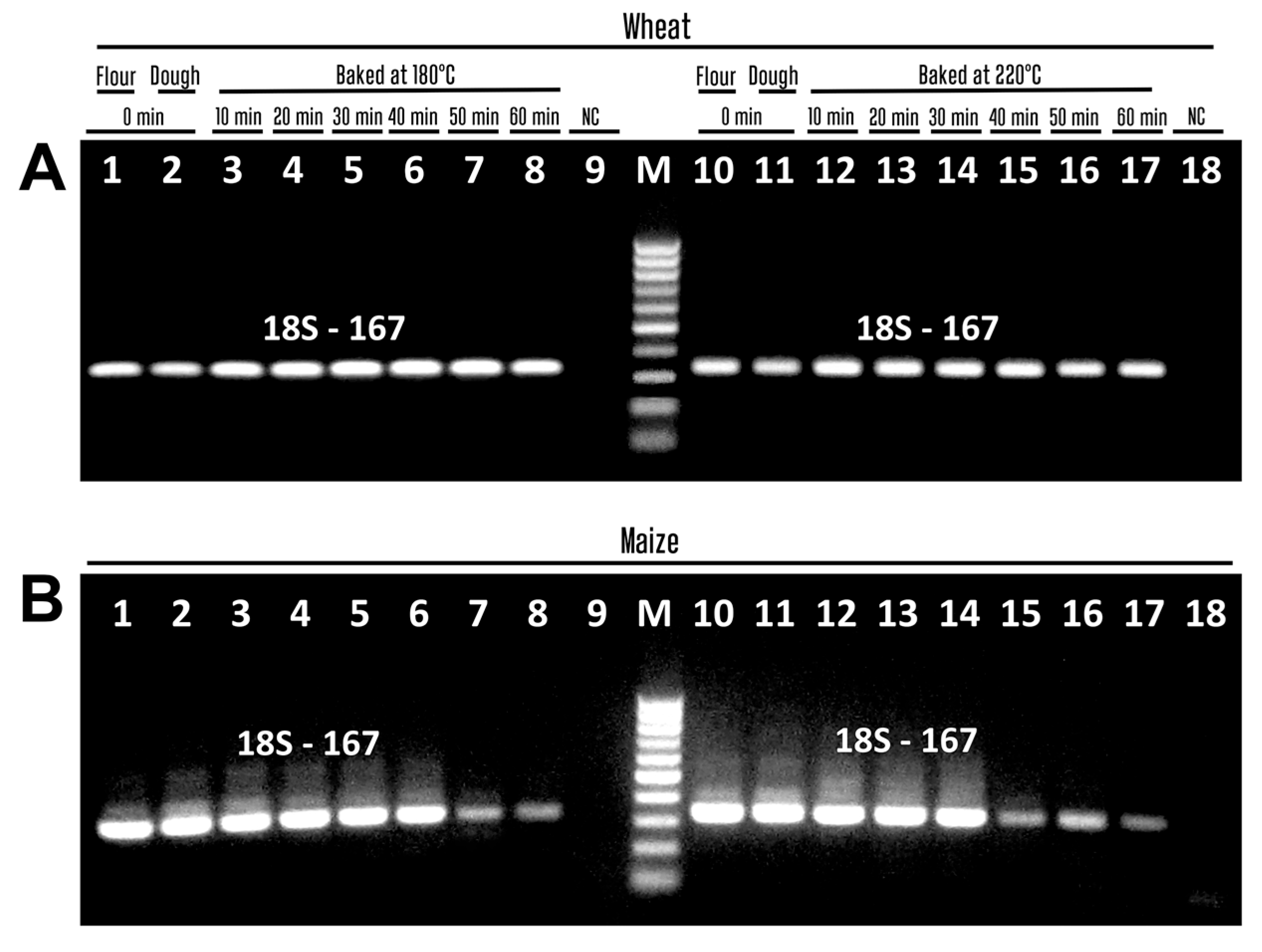 Species effects were also observed on the degradation of both genomic DNA and PCR amplicons. The comparison of DNA electrophoretic images clearly indicated the degradation of both maize and wheat genomes depending on baking duration and temperature. However, maize DNA bands completely disappeared after 60 min of baking at 180 °C and after 40 min of baking at 220 °C, whereas wheat DNA bands remained present in all samples throughout the baking process. This may be due to the higher concentration of wheat DNA compared to maize.