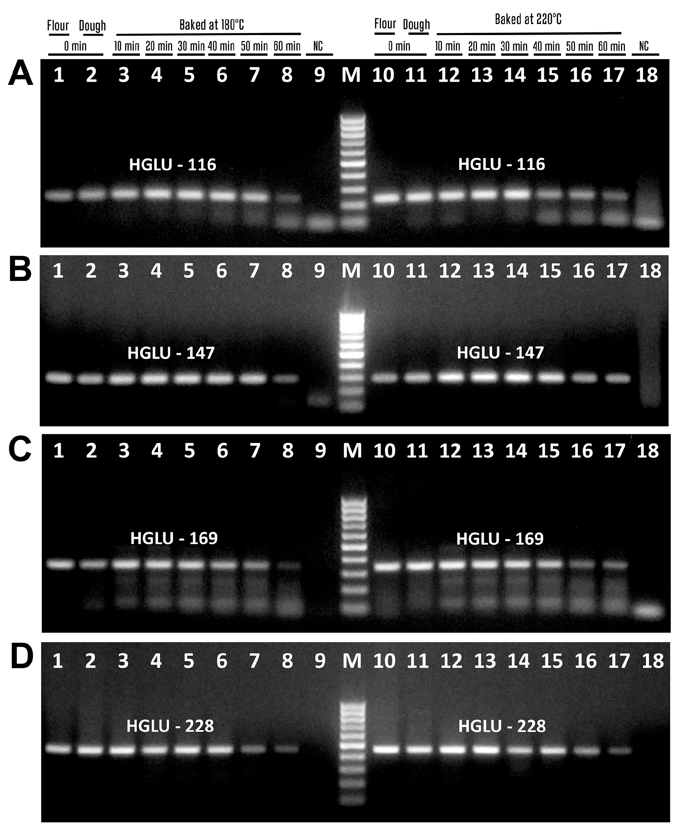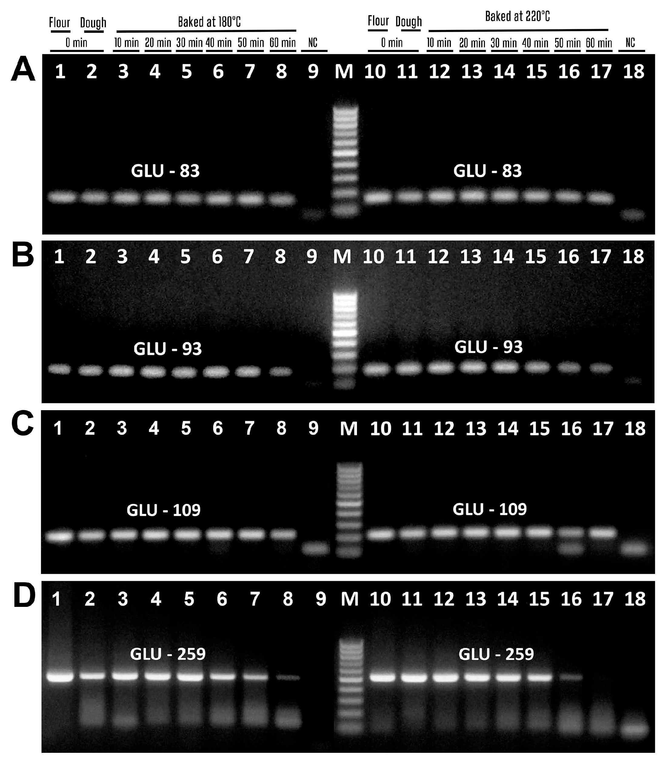 However, GLU-259 amplicons disappeared after baking at 220 °C for 60 min (Figure 6D, lane 17). No amplified products were seen in water samples (Figure 5A–D, lanes 9, 18; Figure 6A–D, lanes 9, 18), indicating the purity and specificity of the PCR experiments.