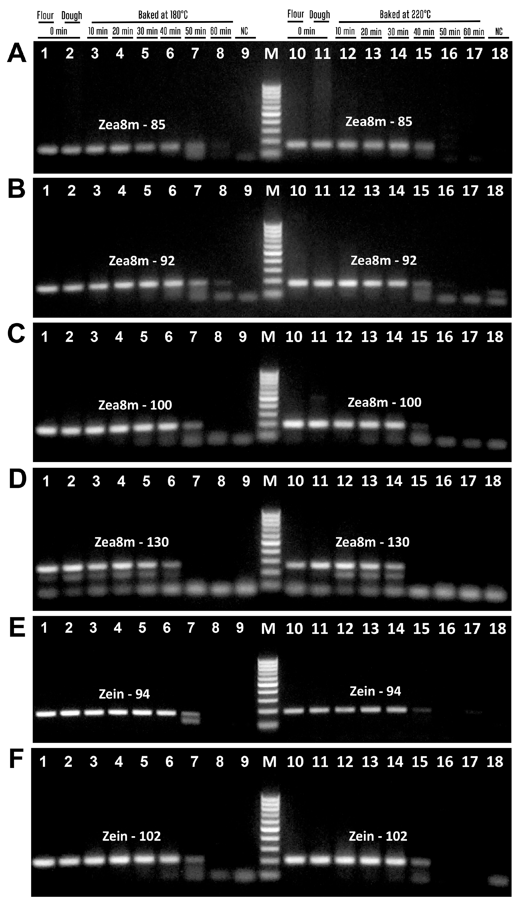 Two pairs of primers targeting maize zein gene produced suitable PCR products, i.e., the primers zein-94f/zein-94f zein-94r generated 94 bp amplicon (Figure 7E, lanes 1–7, 10–15), and the primers zein102f/zein102r generated 102 bp amplicon (Figure 7F, lanes 1–7, 10–15). However, the bands of these amplicons were absent after baking at 180 °C for 60 min (Figure 7E, lane 8) and at 220 °C for 50 min (Figure 7E, lane 16).