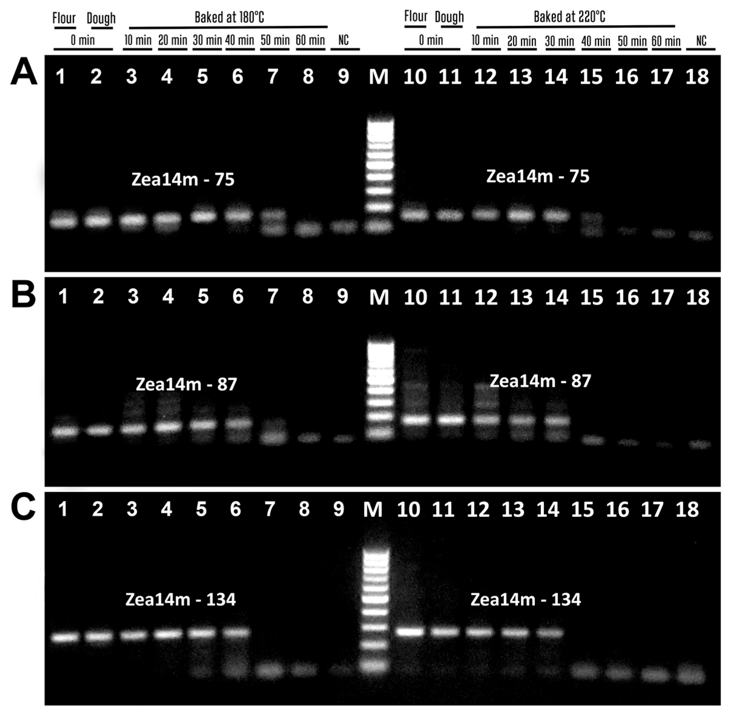 Figure 8 presents the amplification of the phospholipid transfer protein 1 (Zea m 14) gene using three pairs of suitable primers. The amplicons of expected size were produced, i.e., zea14m-75f/zea14m-75r primers generated 75 bp amplicon (Figure 8A, lanes 1–7, 10–15), zea14m87f/zea14m87r primers generated 87 bp amplicon (Figure 8B, lanes 1–7, 10–14), and zea14m134f/zea14m134r primers produced 134 bp amplicon (Figure 8C, lanes 1–6, 10–14). However, during baking at 180 °C, the amplicons Zea14m-75 and Zea14m-87 were no longer detectable after 60 min (Figure 8A,B, lane 8), whereas the Zea14m-134 amplicon was undetectable even after 50 min of treatment. In addition, during baking at 220 °C, the amplicons Zea14m-75 disappeared after 50 min (Figure 8A, lanes 16–17), while the amplicons Zea14m-87 and Zea14m-134 were absent even after 40 min (Figure 8B,C, lanes 15–17). It should be noted that no PCR products were formed in the negative water control in any of the PCR experiments, which indicates the high purity and specificity of the experiments (Figure 7 and Figure 8, lanes 9, 18).