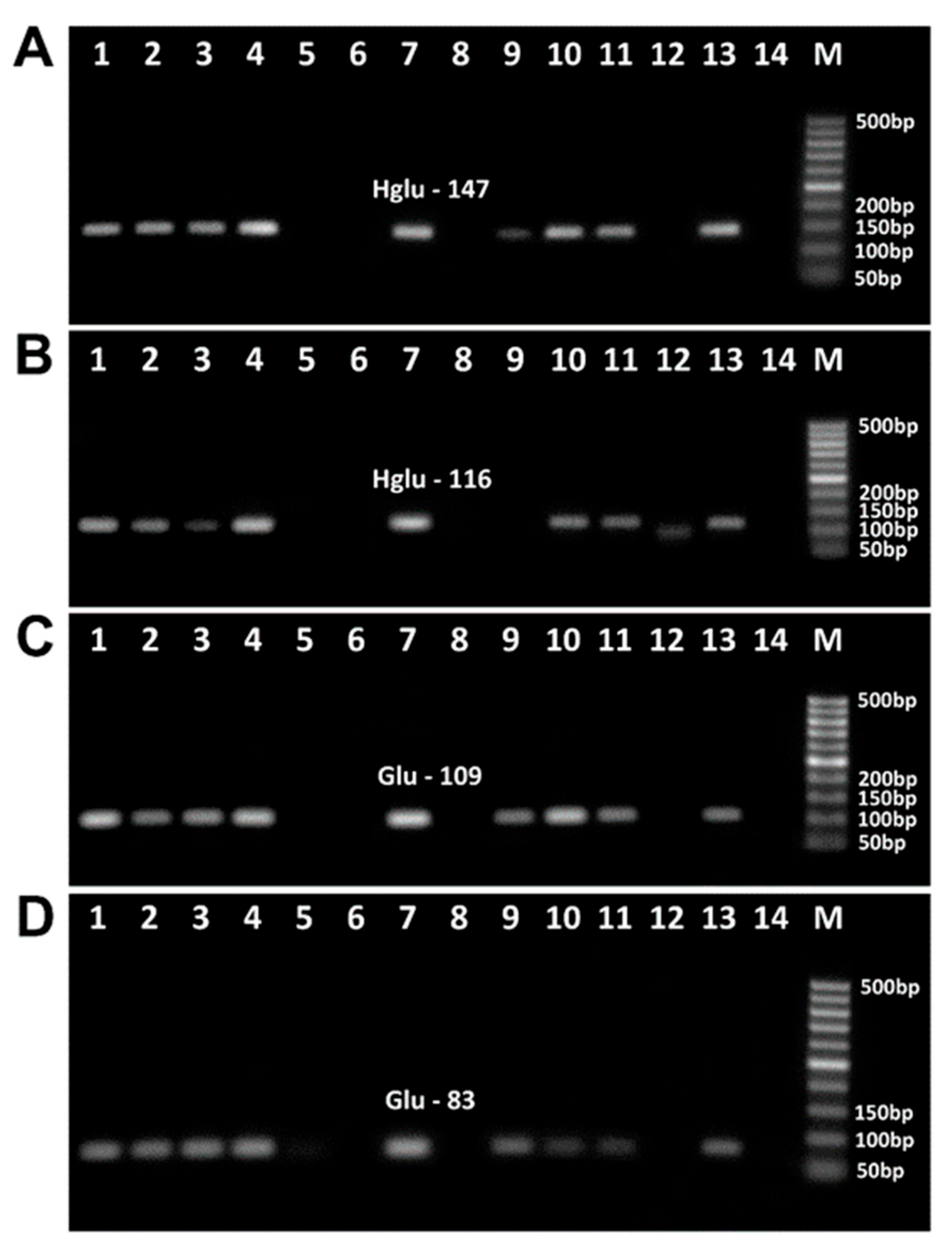 Figure 5 presents PCR products of wheat samples amplified with four pairs of primers corresponding high-molecular-weight glutenin subunit (Wheat HMW-GS) gene. The amplicons of expected size were generated for all samples of wheat DNAs, i.e., the primers Hglu-116f/Hglu-116r generated 116 bp amplicon (Figure 5A, lanes 1–8, 10–17), the primers Hglu-147f/Hglu-147r produced 147 bp amplicon (Figure 5B, lanes 1–8, 10–17), the primers Hglu-169f/Hglu-169r produced 169 bp amplicon (Figure 5C, lanes 1–8, 10–17), and Hglu-228f/Hglu-228r primers generated 228 bp products (Figure 5D, lanes 1–8, 10–17).