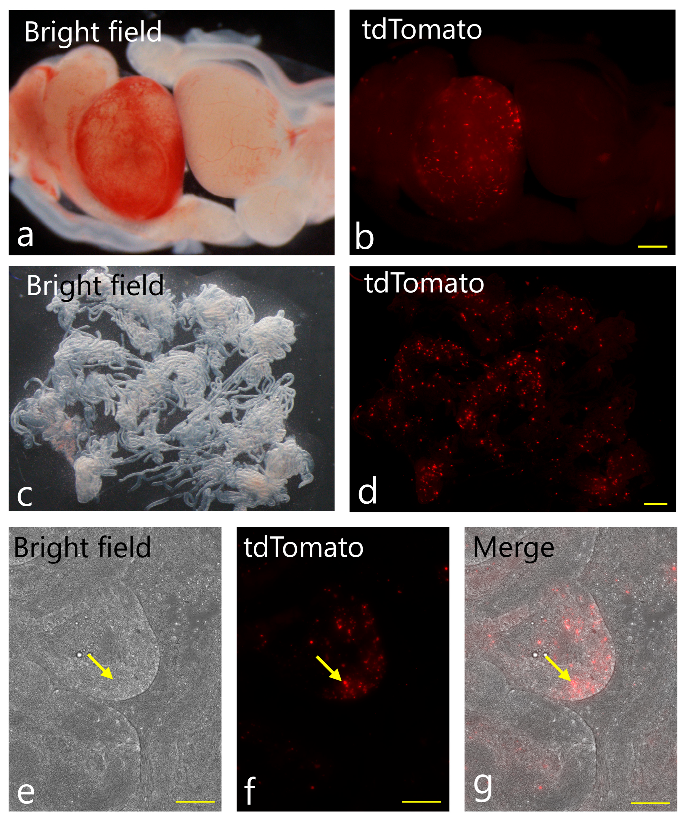- Takehashi, M.; Kanatsu-Shinohara, M.; Inoue, K.; Ogonuki, N.; Miki, H.; Toyokuni, S.; Ogura, A.; Shinohara, T. Adenovirus-mediated gene delivery into mouse spermatogonial stem cells. Proc. Natl. Acad. Sci. USA 2007, 104, 2596–2601. [Google Scholar] [CrossRef]