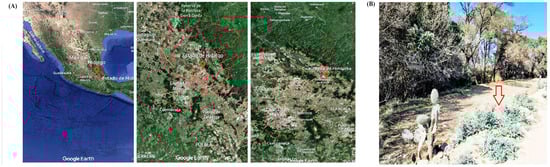 (A) Argemone mexicana L. plant material collection site; (B) Argemone mexicana L. plants in vegetative development, the red arrow indicates the species used for the experiment. Map data ©2025 Google.