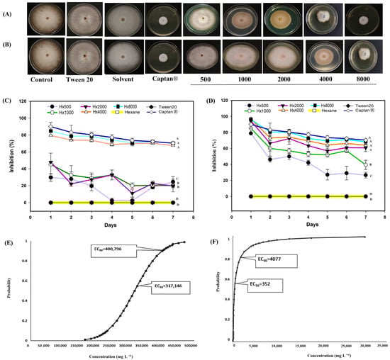 For S. sclerotiorum (Figure 7), the hexanic extract was effective at concentrations of 4000 and 8000 mg L−1 (Figure 7A,B). At 8000 mg L−1, biological activity remained above 60% (Figure 7C), while at concentrations of 4000 and 8000 mg L−1, the methanolic extract inhibited growth by more than 90% throughout the evaluation (Figure 7D). In this phytopathogenic fungus the commercial fungicide Captan® presented fungistatic activity with the different concentration gradients 1:10 (control 4) 1:100 (control 5) and 1:1000 (control 6) unlike the rest of the phytopathogenic fungi considered in this experiment, where controls 4 and 5 presented fungicidal activity. For example in S. sclerotiorum controls, number 4 and 5 completely inhibited growth throughout the first three days of evaluation, control number 4 (1:10) maintained its efficiency above 80% the rest of the evaluation, while control 5 (1:100) remained above 70% throughout the experiment (Figure 7C,D); With control number 6 (1:1000) the first day presented an inhibition of 100% and throughout the evaluation it had a decline, however the biological efficiency remained above 50% (Figure 7A,B). Probit analysis for S. sclerotiorum revealed that the hexane extract had an EC50 of 560 mg L−1, with a range between 469 and 655 mg L−1, and an EC90 of 7776 within a range of 6600 and 9384 mg L−1 (Figure 7E). The methanolic extract had an EC50 of 53 mg L−1, and an EC90 of 909 mg L−1 (Figure 7F).