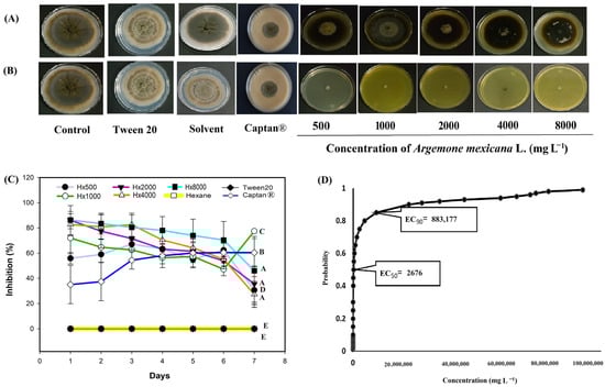 Antifungal effect of Argemone mexicana L. extracts against Colletotrichum gloeosporioides after 7 days: (A) hexanic extract; (B) methanolic extract; (C) fungal growth inhibition (%) of the hexanic extract; and (D) Probit analysis of the hexanic extract. Different letters between treatments indicate significant differences according to the Hotelling test (α = 0.05). N = 3 replicates per treatment. Controls: Negative control = PDA only; Tween 20 = PDA + 0.1% Tween 20 surfactant; Solvent = PDA + hexane or methanol; and Control 6: Captan® = PDA +1:1000 Captan. A. mexicana extracts contained PDA, surfactant, and solvent. Effective concentrations (EC50 and EC90) corresponded to the fungicide concentrations required to inhibit 50% and 90% of mycelial growth, respectively, compared with the untreated control. These values represent the biological effect produced by the concentration of the extract estimated through dose–response regression analysis.