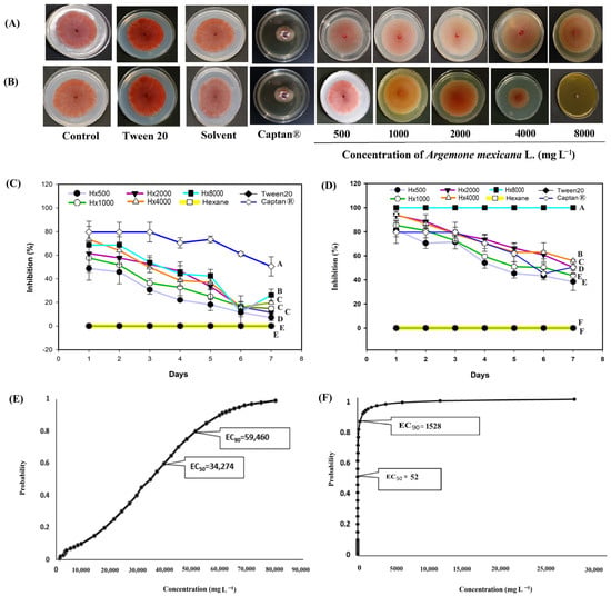 Antifungal effect of Argemone mexicana L. extracts against Fusarium oxysporum after 7 days: (A) hexanic extract; (B) methanolic extract; (C) fungal growth inhibition (%) of hexanic extract; (D) fungal growth inhibition (%) of the methanolic extract; (E) Probit analysis of the hexanic extract; and (F) Probit analysis of the methanolic extract. Different letters between treatments indicate significant differences according to the Hotelling test (α = 0.05). N = 3 replicates per treatment. Controls: Negative control = PDA only; Tween 20 = PDA + 0.1% Tween 20 surfactant; Solvent = PDA + hexane or methanol; and Control 6: Captan® = PDA +1:1000 Captan. A. mexicana extracts contained PDA, surfactant, and solvent. Effective concentrations (EC50 and EC90) correspond to the fungicide concentrations required to inhibit 50% and 90% of mycelial growth, respectively, compared with the untreated control. These values represent the biological effect produced by the extract concentration estimated through dose–response regression analysis.
