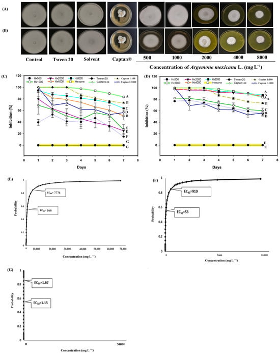 Antifungal effect of Argemone mexicana L. extracts against Sclerotinia sclerotiorum after 7 days: (A) hexanic extract; (B) methanolic extract; (C) fungal growth inhibition (%) of the hexanic extract; (D) fungal growth inhibition (%) of the methanolic extract; (E) Probit analysis of the hexanic extract; and (F) Probit analysis of the methanolic extract. (G) Probit analysis of the Captan®. Different letters between treatments indicate significant differences according to the Hotelling test (α = 0.05). N = 3 replicates per treatment. Controls: Negative control = PDA only; Tween 20 = PDA + 0.1% Tween 20 surfactant; Solvent = PDA + hexane or methanol; and Control 6: Captan® = PDA +1:1000 Captan. A. mexicana extracts contained PDA, surfactant, and solvent. Effective concentrations (EC50 and EC90) correspond to the fungicide concentrations required to inhibit 50% and 90% of mycelial growth, respectively, compared with the untreated control. These values represent the biological effect produced by the extract concentration estimated through dose–response regression analysis.