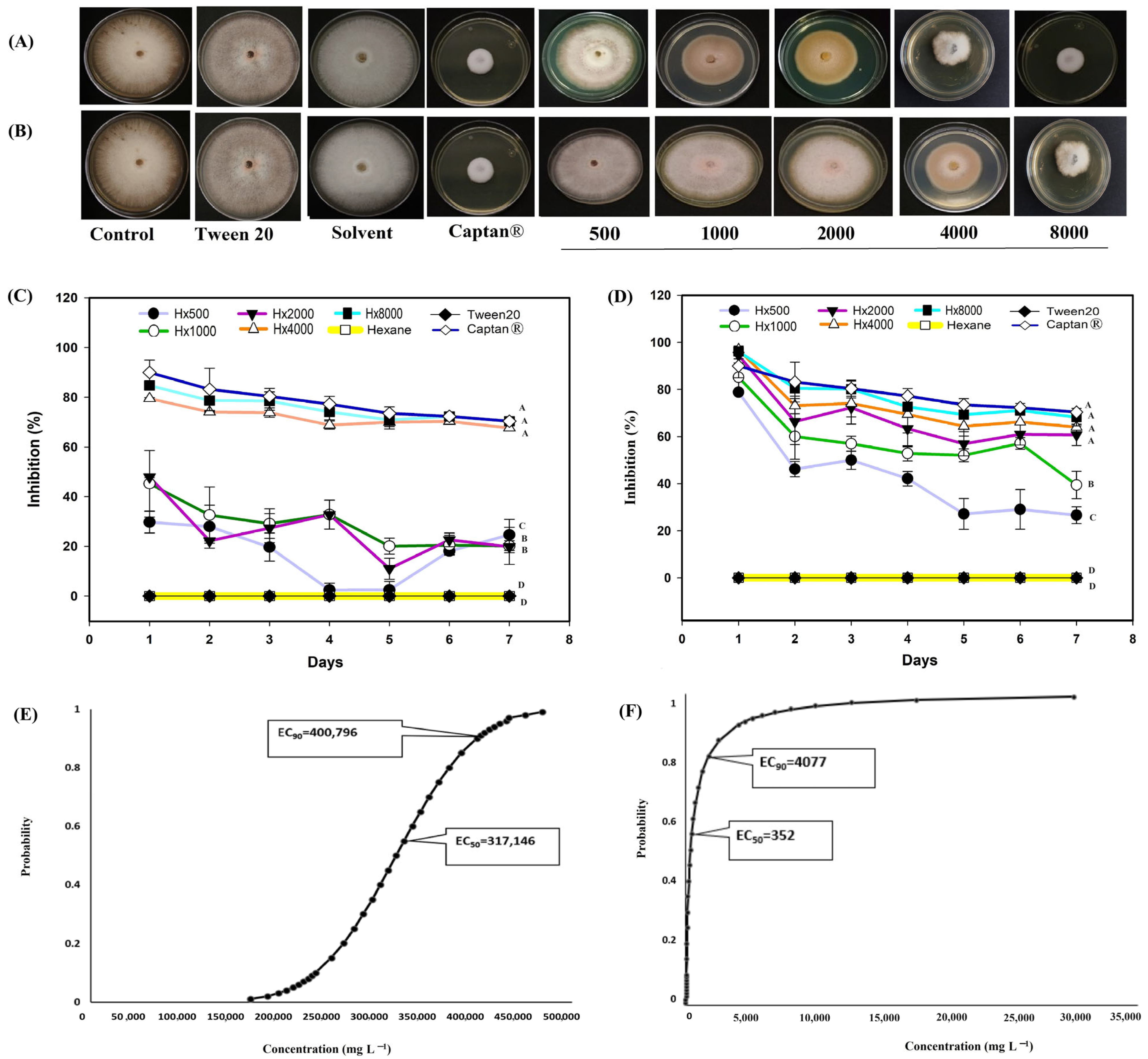 - Cenobio-Galindo, A.D.J.; Hernández-Fuentes, A.D.; González-Lemus, U.; Zaldívar-Ortega, A.K.; González-Montiel, L.; Madariaga-Navarrete, A.; Hernández-Soto, I. Biofungicides based on plant extracts: On the road to organic farming. Int. J. Mol. Sci. 2024, 25, 6879. [Google Scholar] [CrossRef]
