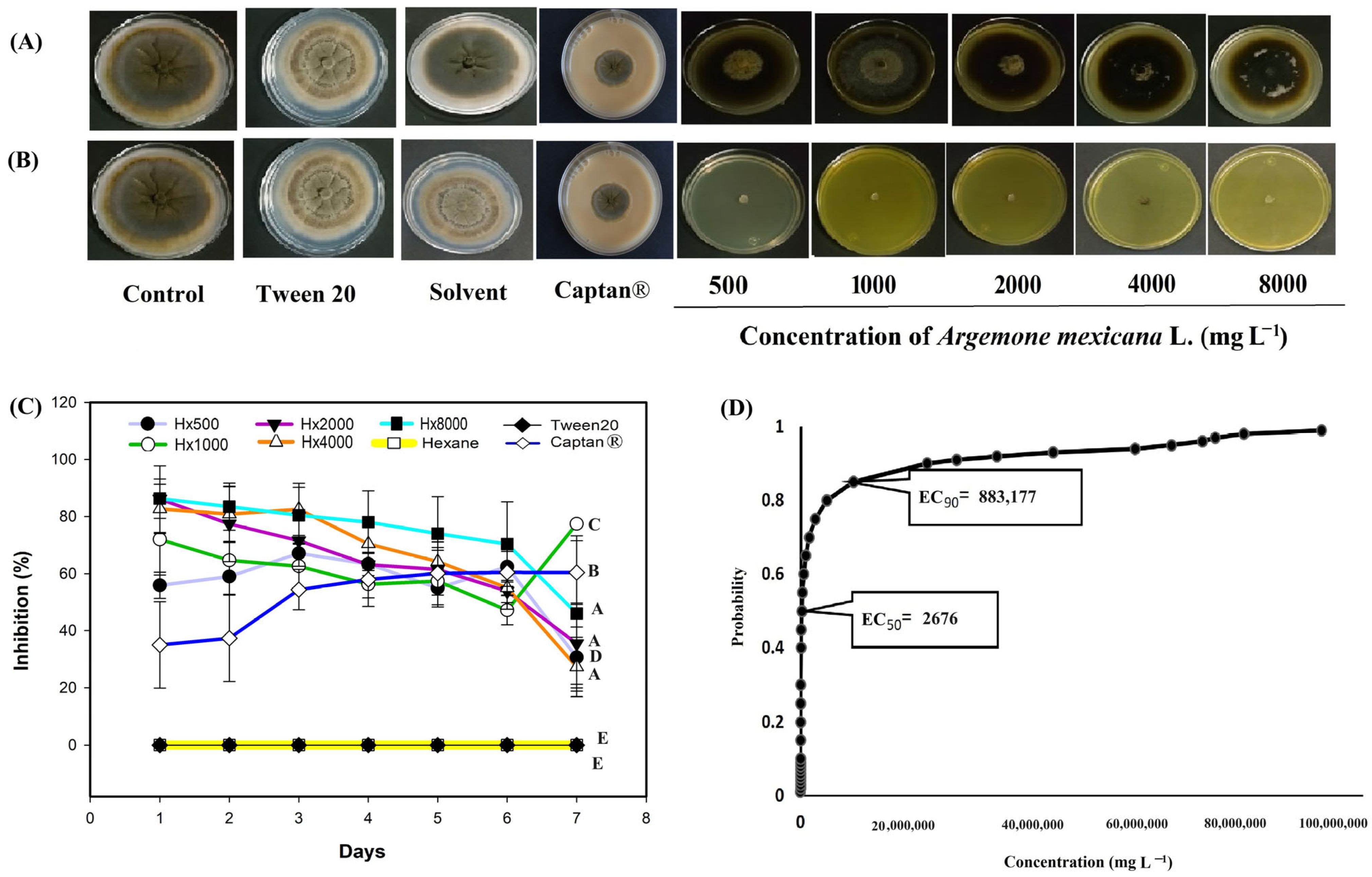 - Soto, I.H.; Maldonado, A.J.; Montiel, R.G.C.; Álvarez, G.A.; Hernández-Fuentes, A.D. Argemone mexicana contiene metabolitos secundarios que controlan hongos fitopatógenos. Boletín Cienc. Agropecu. Del ICAP 2022, 8, 6–10. [Google Scholar] [CrossRef]