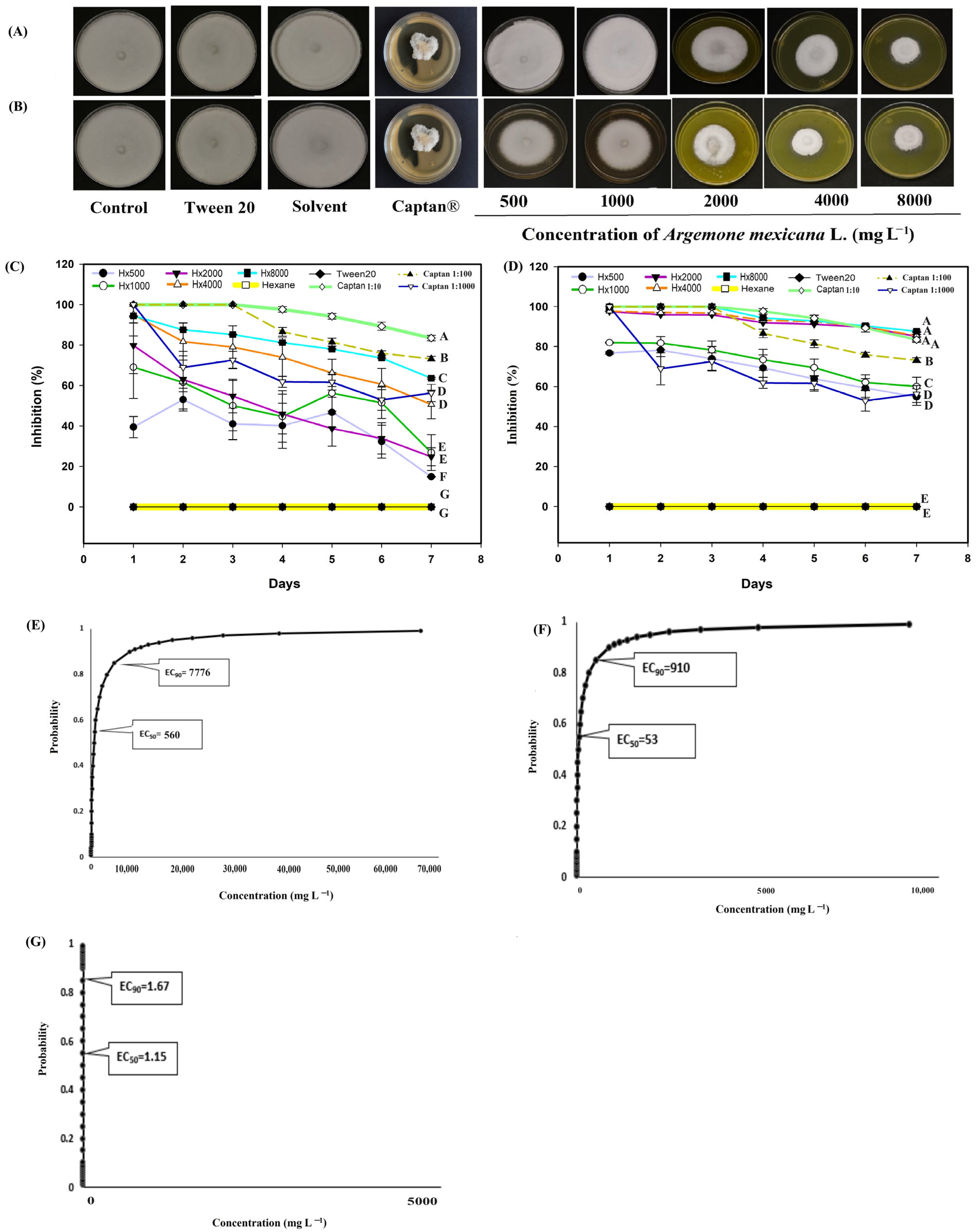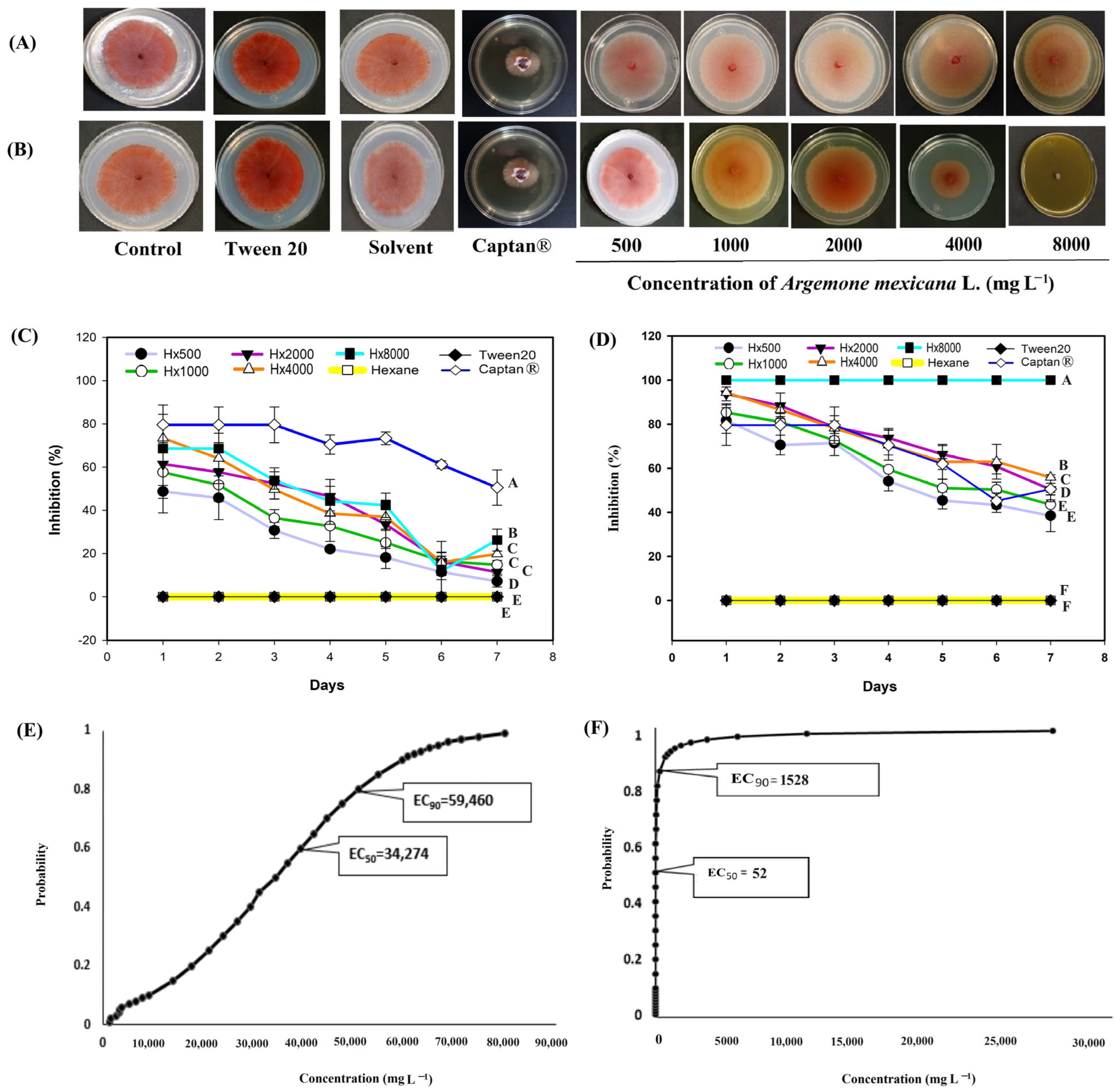 - Hernández-Soto, I.H.; Prieto-Méndez, J.; Aquino-Torres, E.; Pacheco-Trejo, J. Evaluation of the effect of the methanolic extract of Argemone ochroleuca for environmentally friendly control of Colletotrichum gloeosporioides, Fusarium oxysporum and Rhizoctonia solani. Ciência Técnica Vitivinícola 2018, 33, 65–74. [Google Scholar]