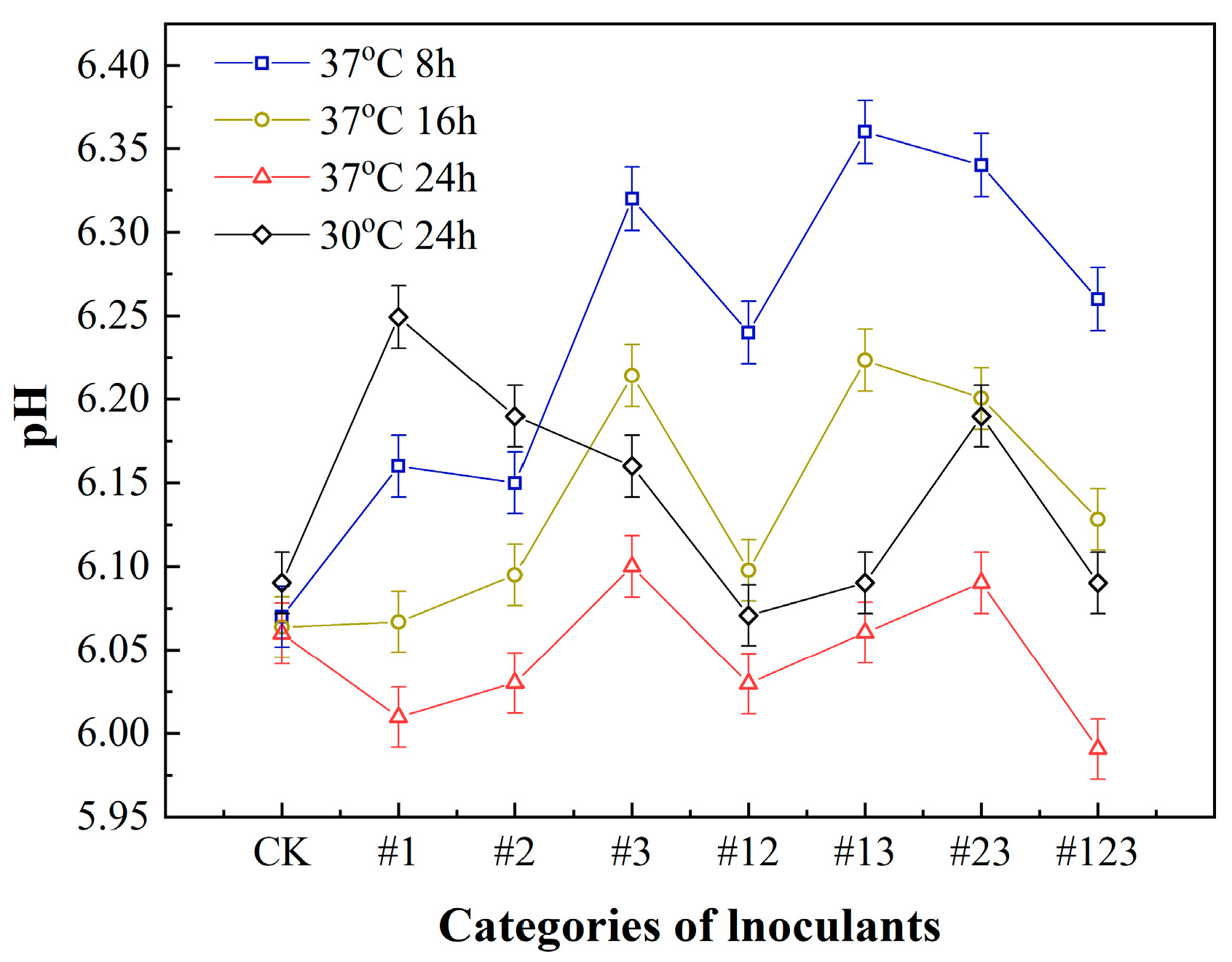| 37 °C 8 h | 55 | 63 | 69 | 62 | 75 | 63 | 62 |