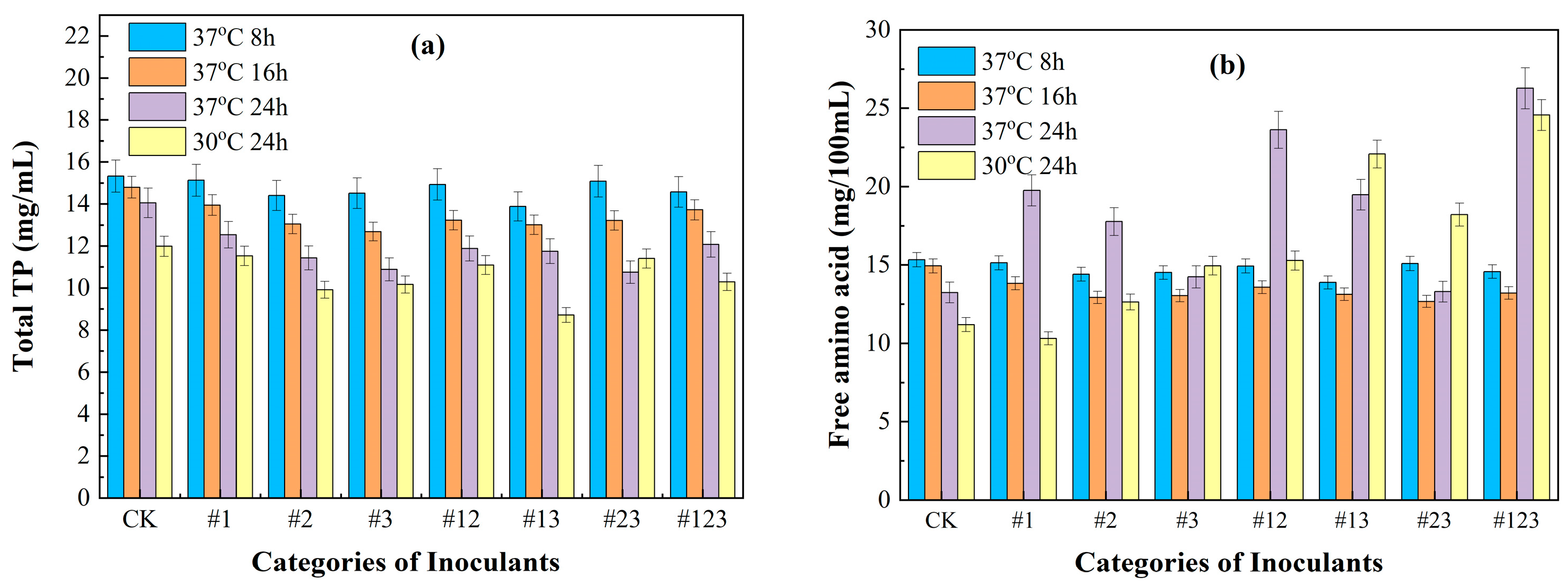 3.2. The Content of Total Tea Polyphenols and Free Amino Acid Content Inoculated with Different Microbial Agents