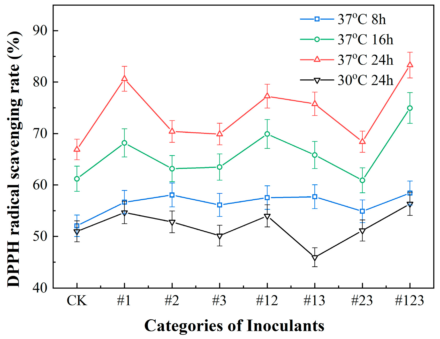 3.3.1. DPPH Radical Scavenging Capacity of Suaeda Tea Inoculated with Different Microbial Agents